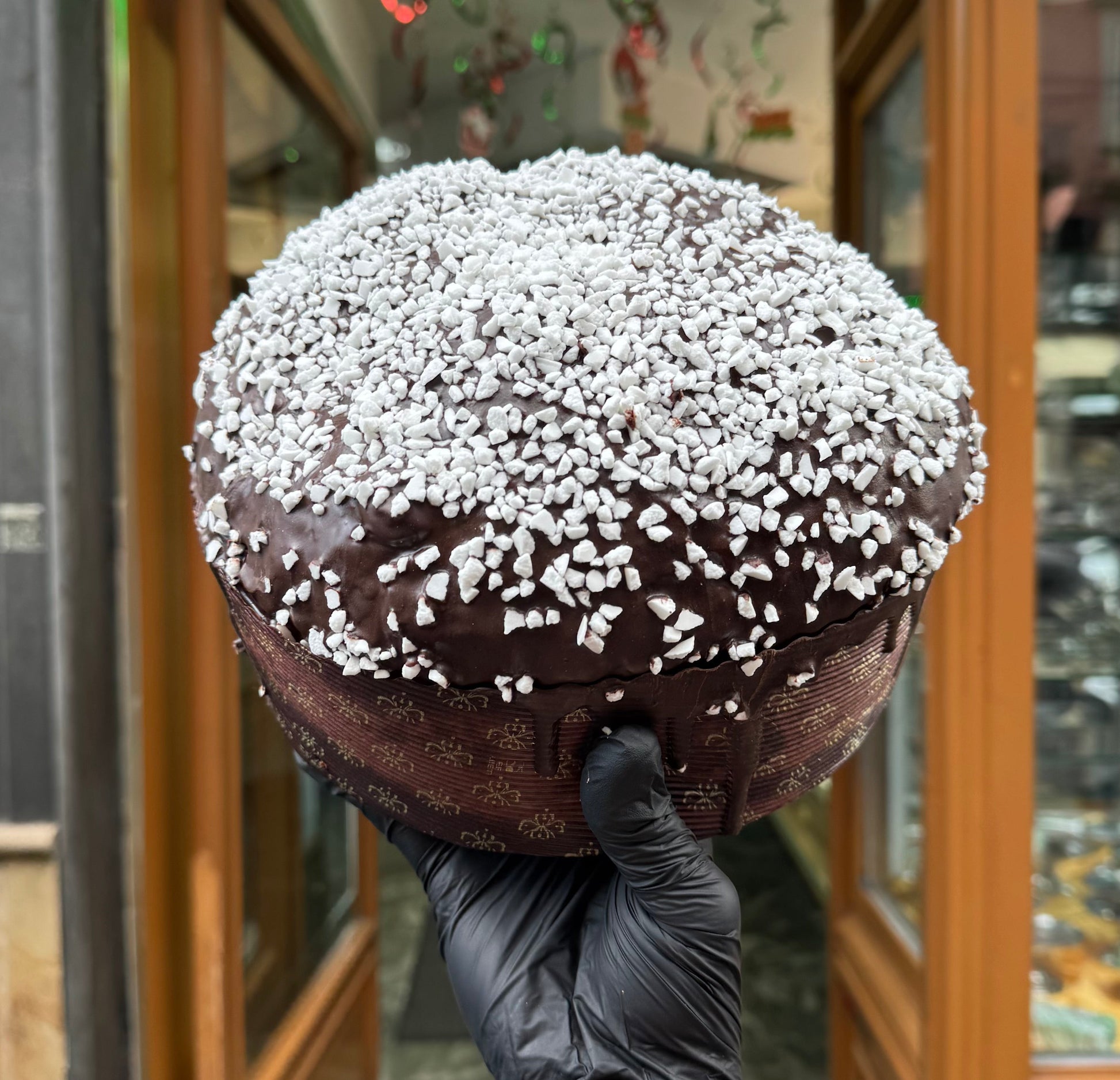 Panettone artigianale al gusto Zuppa Inglese: un impasto soffice e profumato aromatizzato all’Alchermes, arricchito da una golosa farcitura di amarene, cubotti di cioccolato fondente e una crema alla zuppa inglese. Un intreccio di sapori intensi e avvolgenti che richiama la tradizione più autentica.